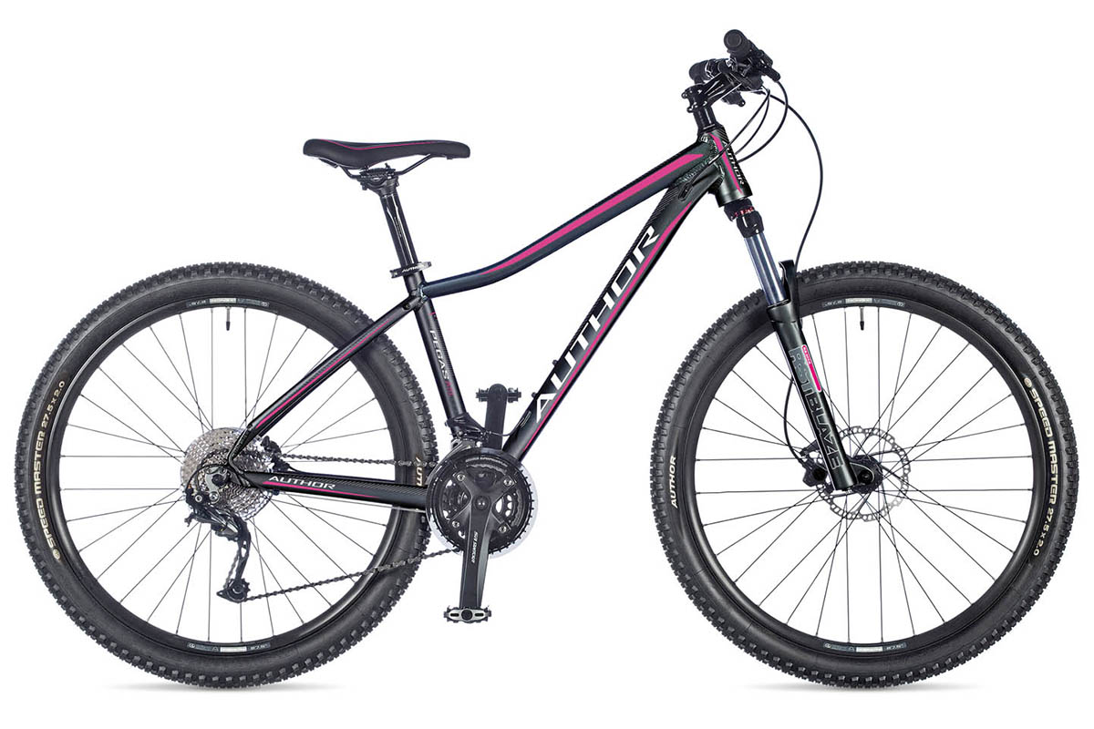 Author Pegas ASL - женский горный велосипед на 27.5-дюймовых колесах. Отличительные особенности велосипеда: рама с гидроформингом труб, блокируемая амортизационная вилка, гидравлические дисковые тормоза и 27 скоростей.